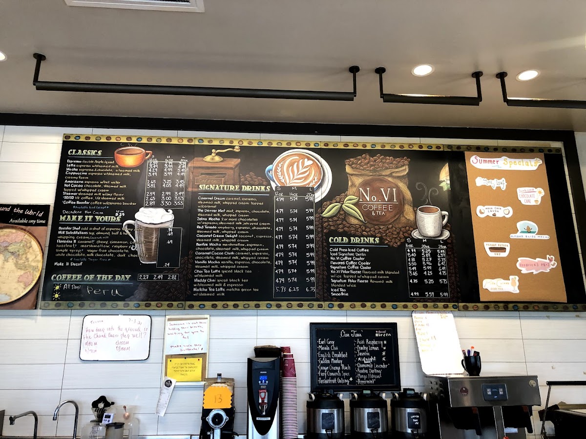 Overall, the menu reflects the warm and laid-back vibe of No.VI Coffee and Tea, inviting guests to linger over thoughtfully prepared coffees, teas, and casual bites that feel right at home during quiet mornings, work breaks, or relaxed catch-ups.
